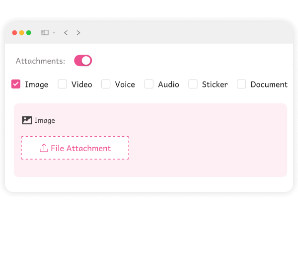 Multi-attachment SupportThe tool supports multiple types of attachments, including images, videos, audio, documents, and stickers. Attachments help make your messages more engaging and visually appealing, ensuring better interaction with your audience.